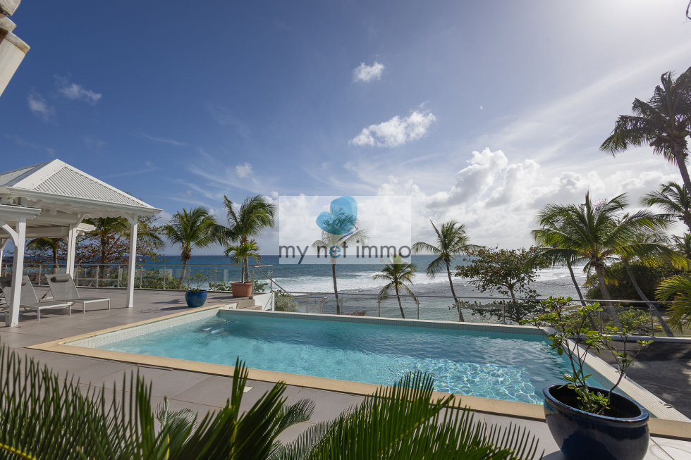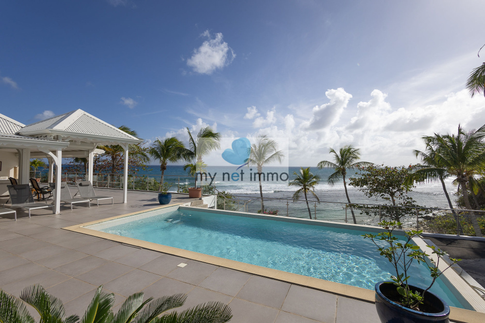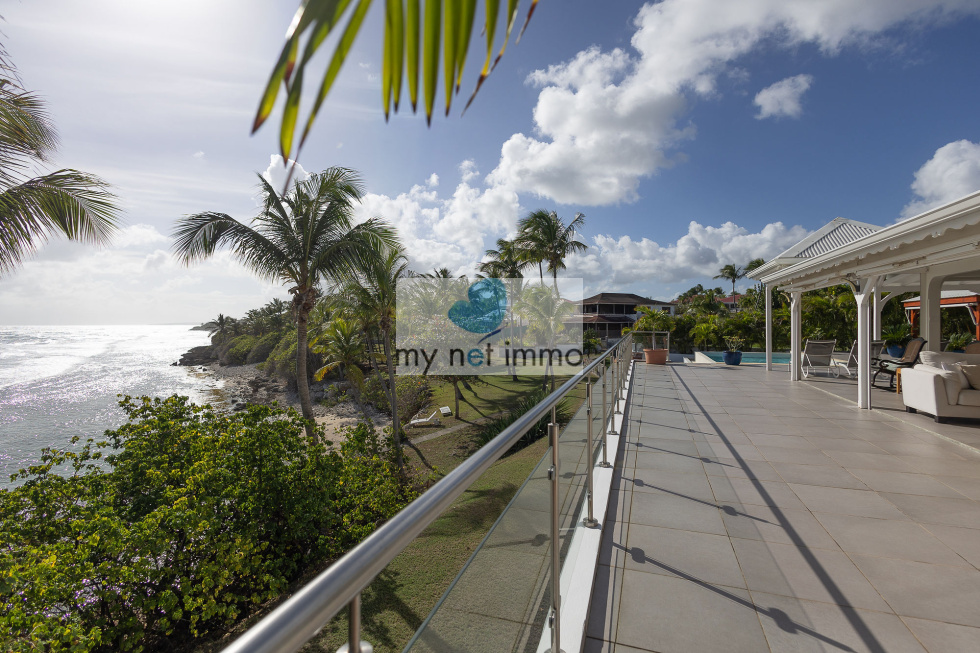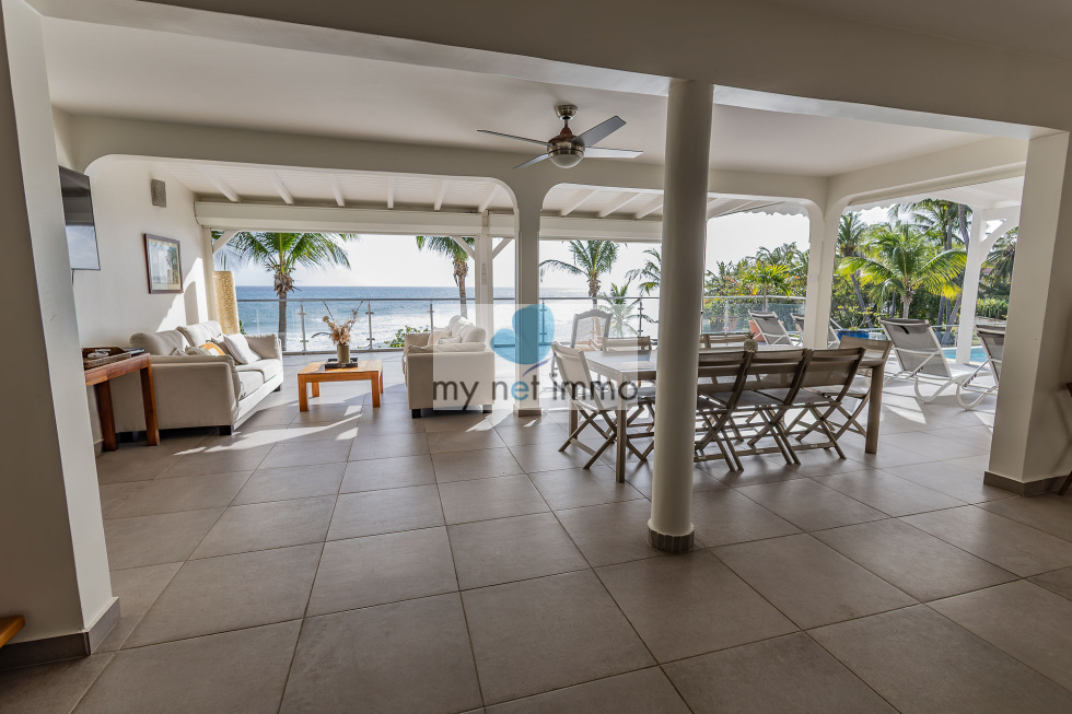 La terrasse ombragée et parfaitement ventilée se prolonge vers un carbet face à la piscine, créant un grand espace de vie extérieur de plain pieds pour se détendre face à la mer.