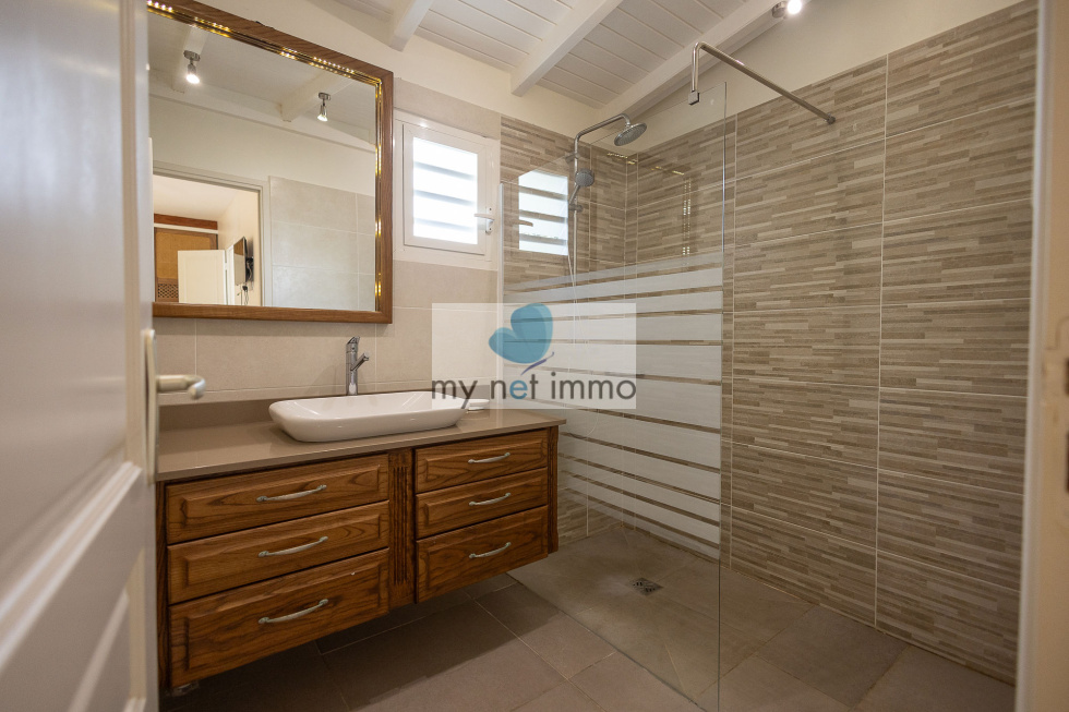 La villa s’organise autour d’un vaste salon lumineux, ouvert sur une vaste terrasse couverte sur laquelle on profite pleinement de la vue mer et des alizés. La cuisine ouverte, entièrement équipée, est complétée par un cellier indépendant.