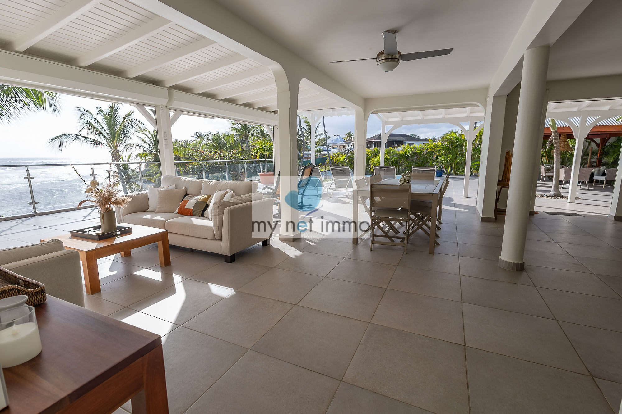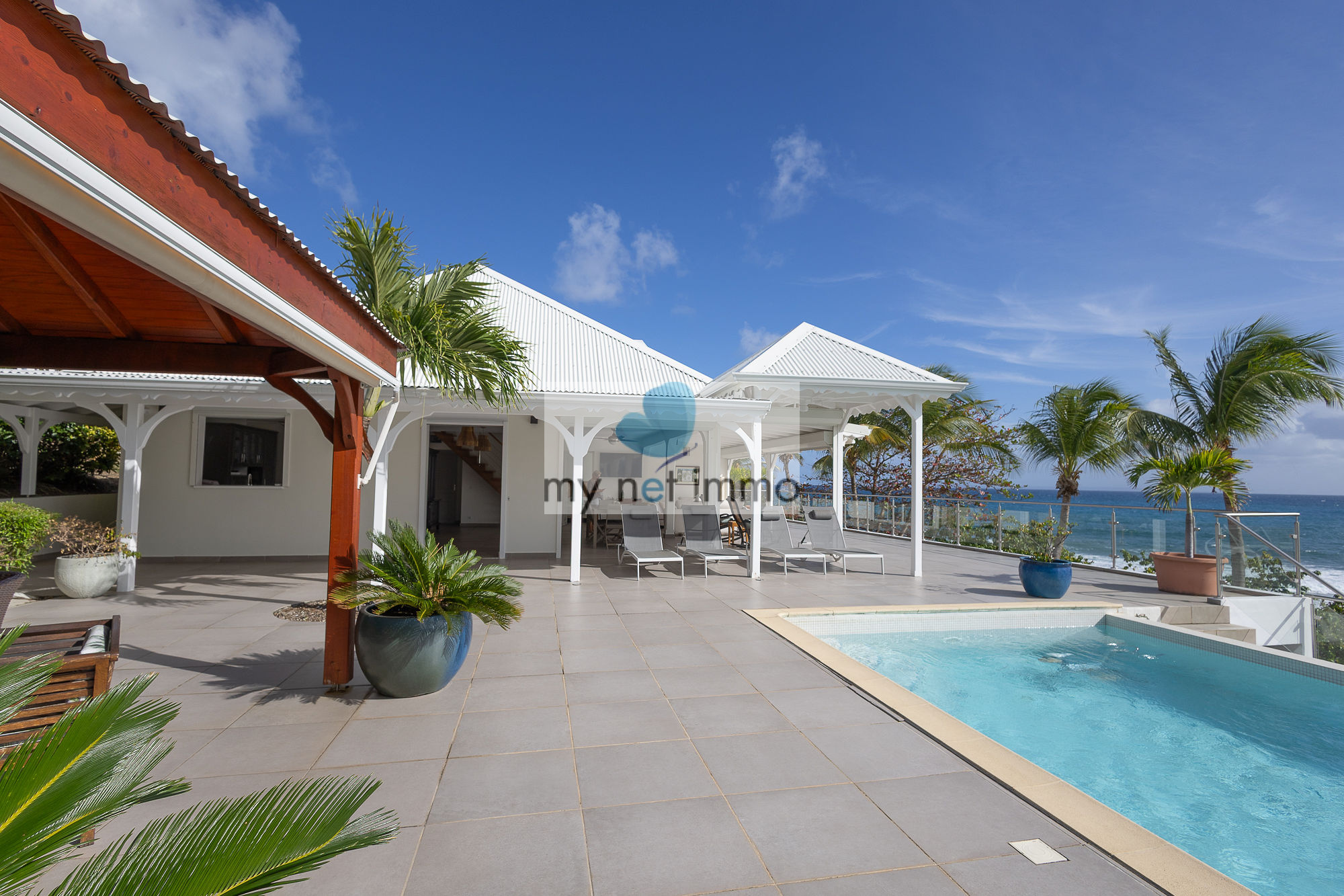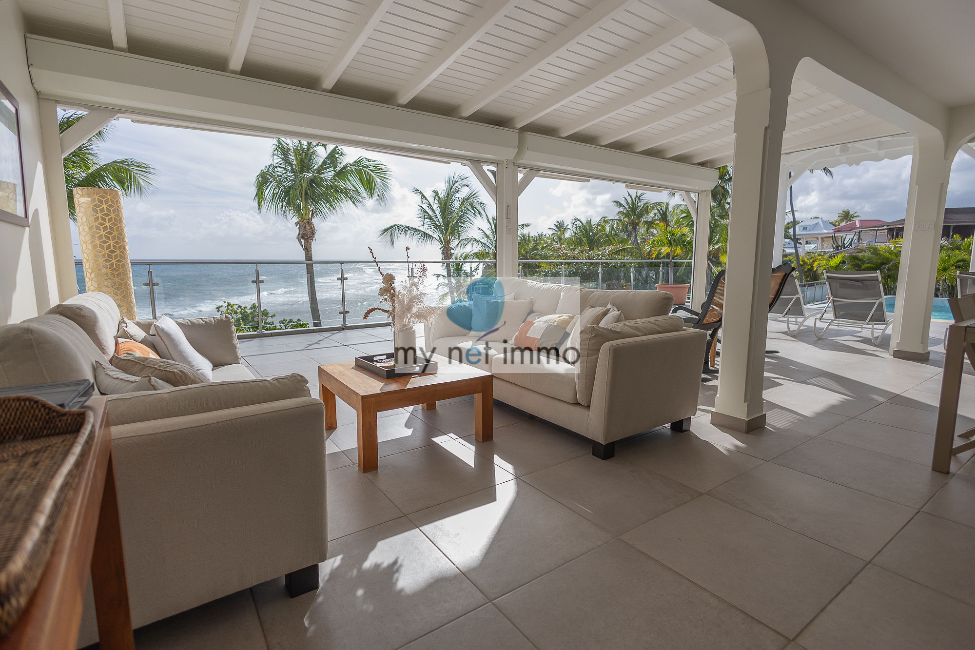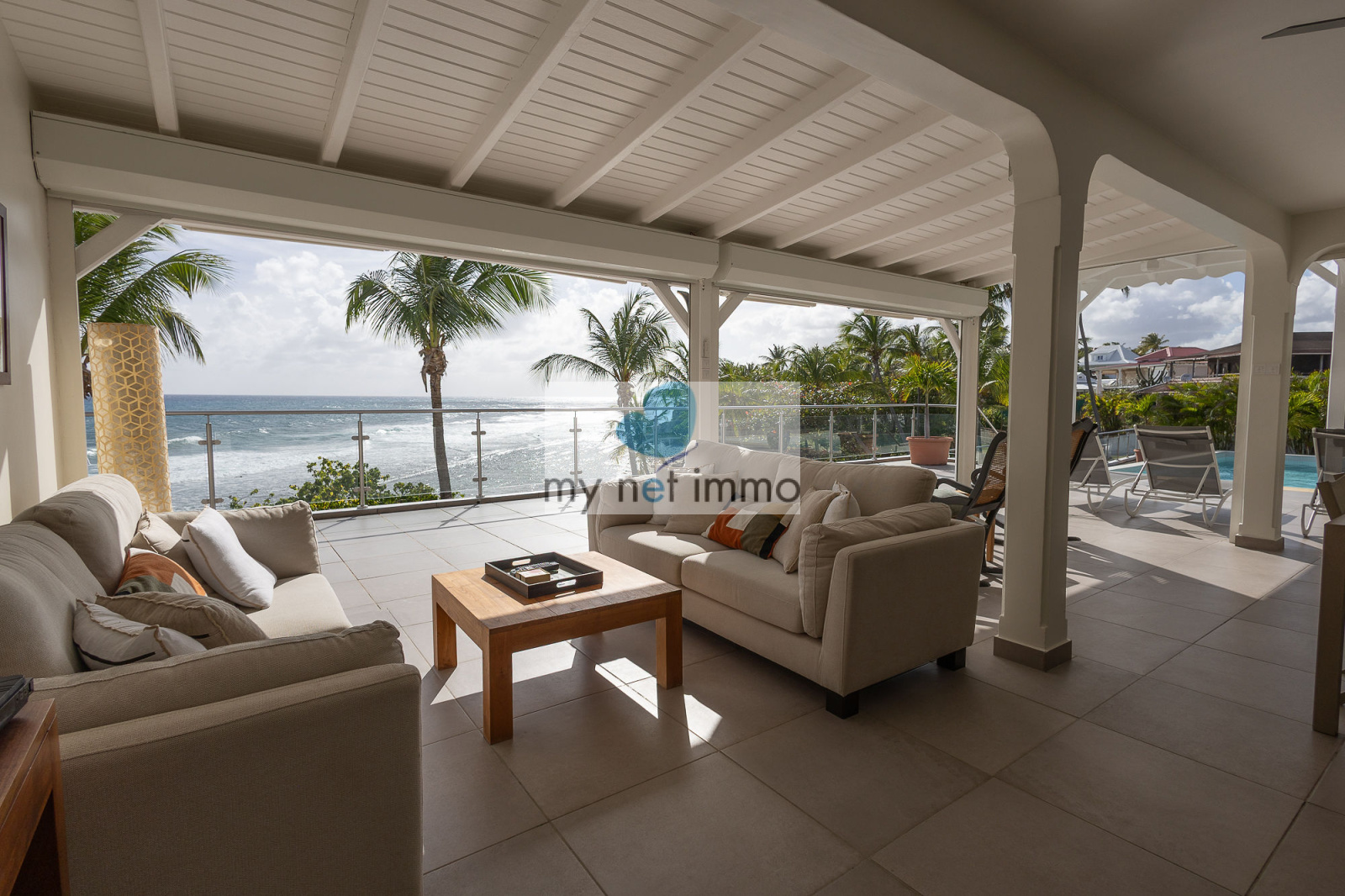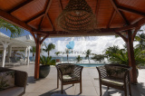 La terrasse ombragée et parfaitement ventilée se prolonge vers un carbet face à la piscine, créant un grand espace de vie extérieur de plain pieds pour se détendre face à la mer.