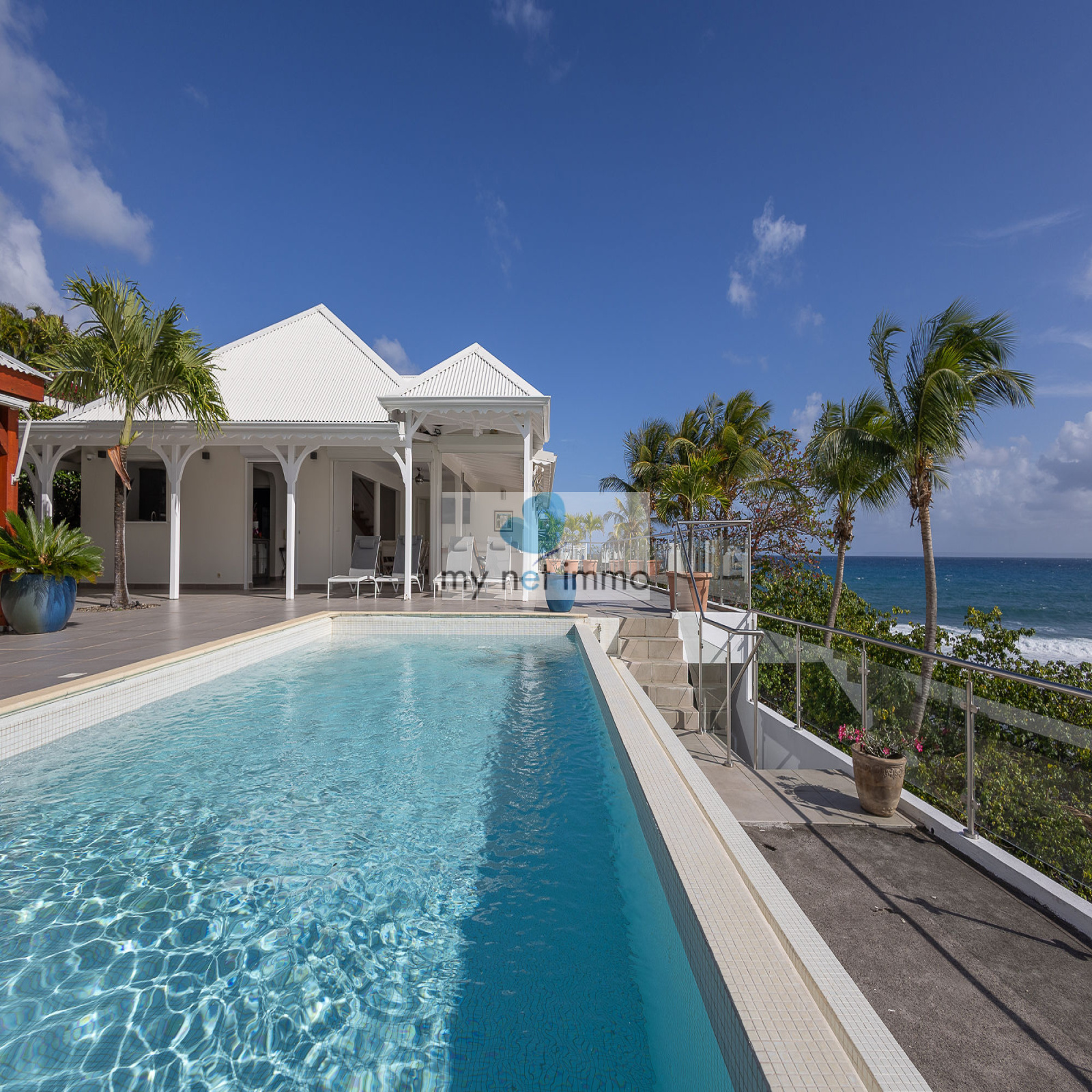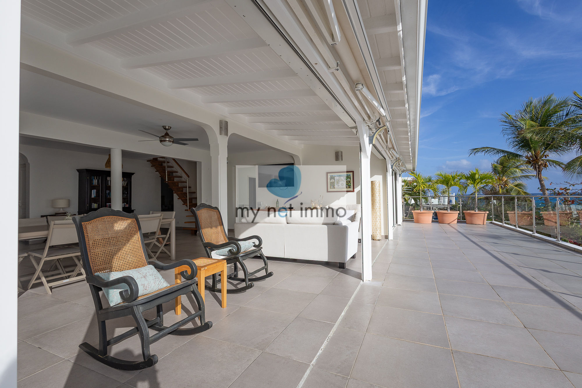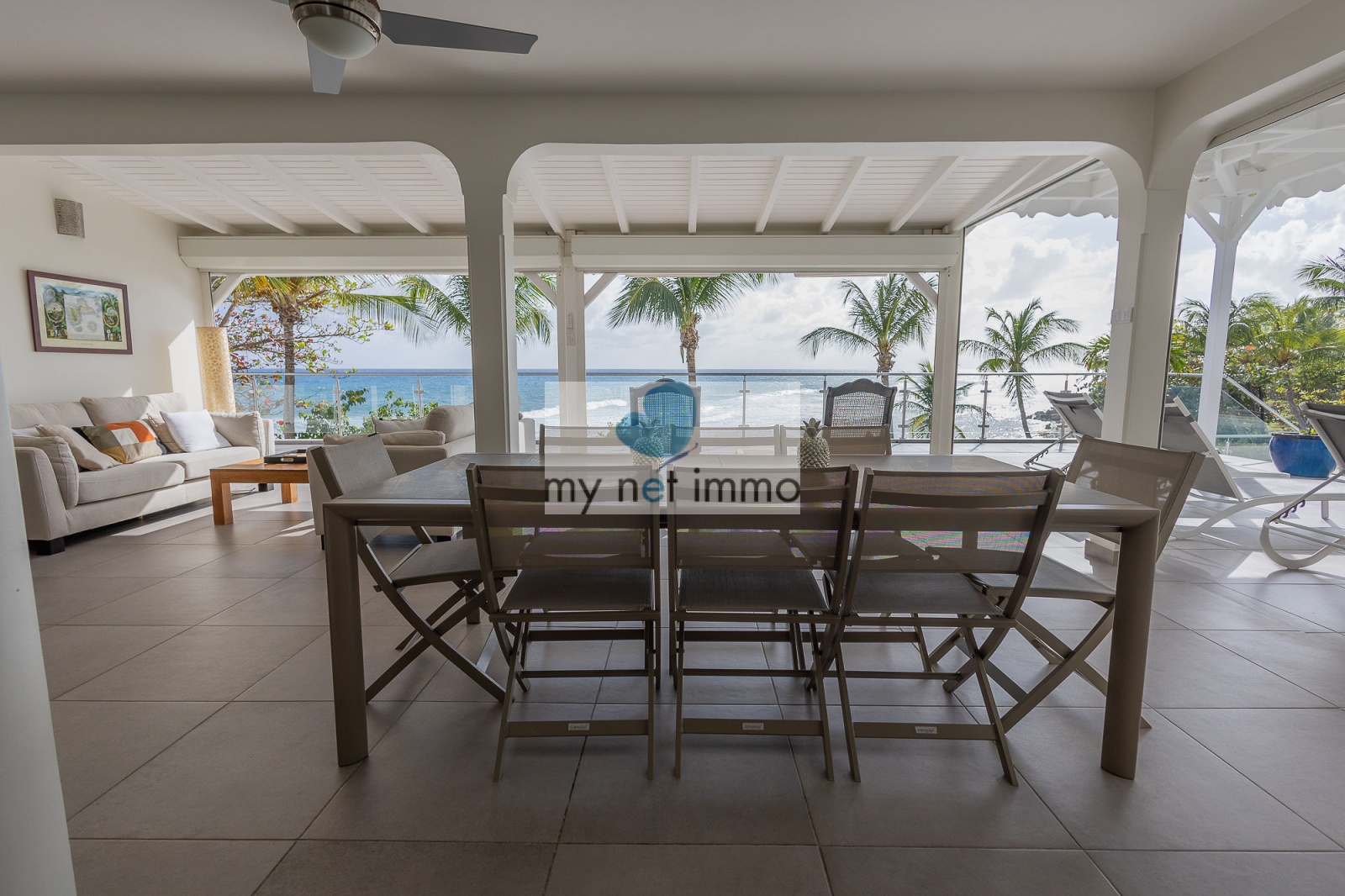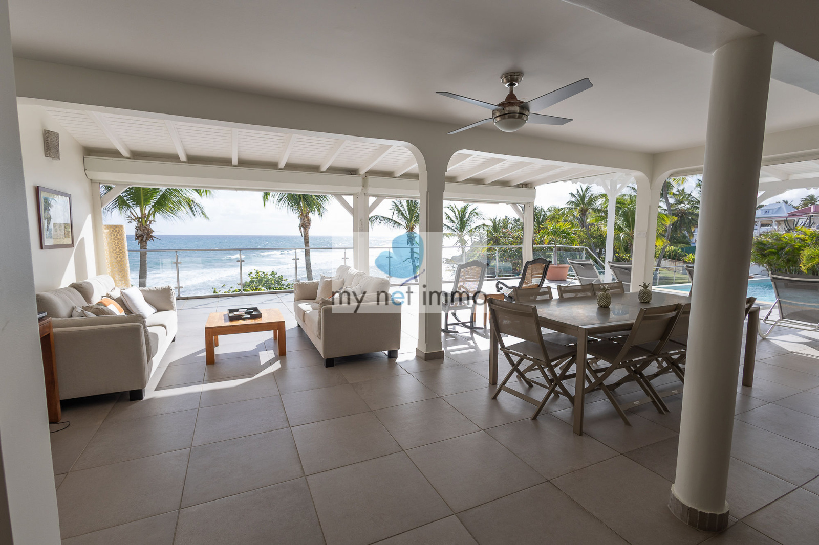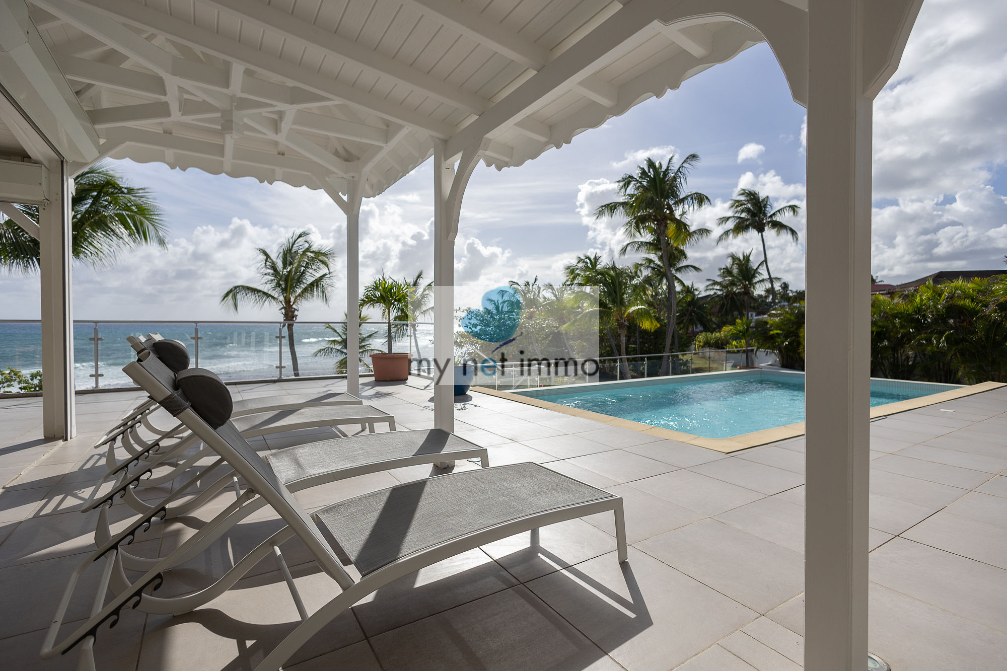 La terrasse ombragée et parfaitement ventilée se prolonge vers un carbet face à la piscine, créant un grand espace de vie extérieur de plain pieds pour se détendre face à la mer.