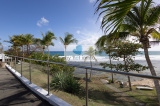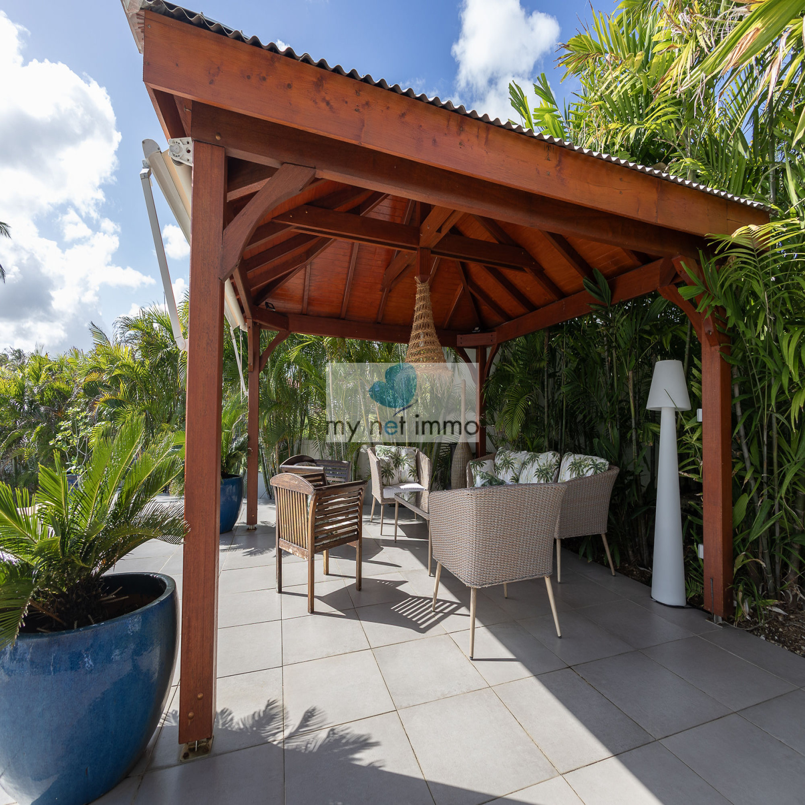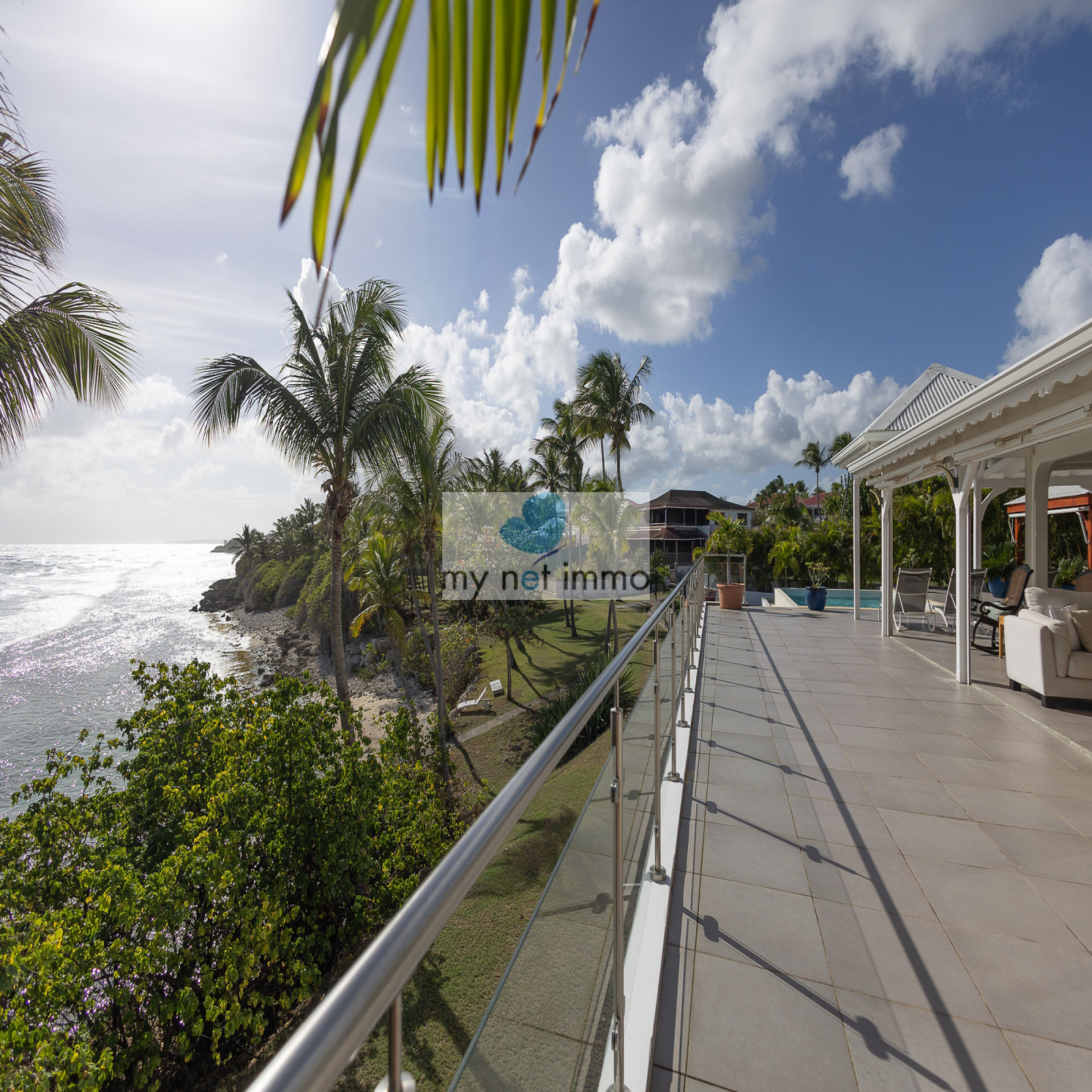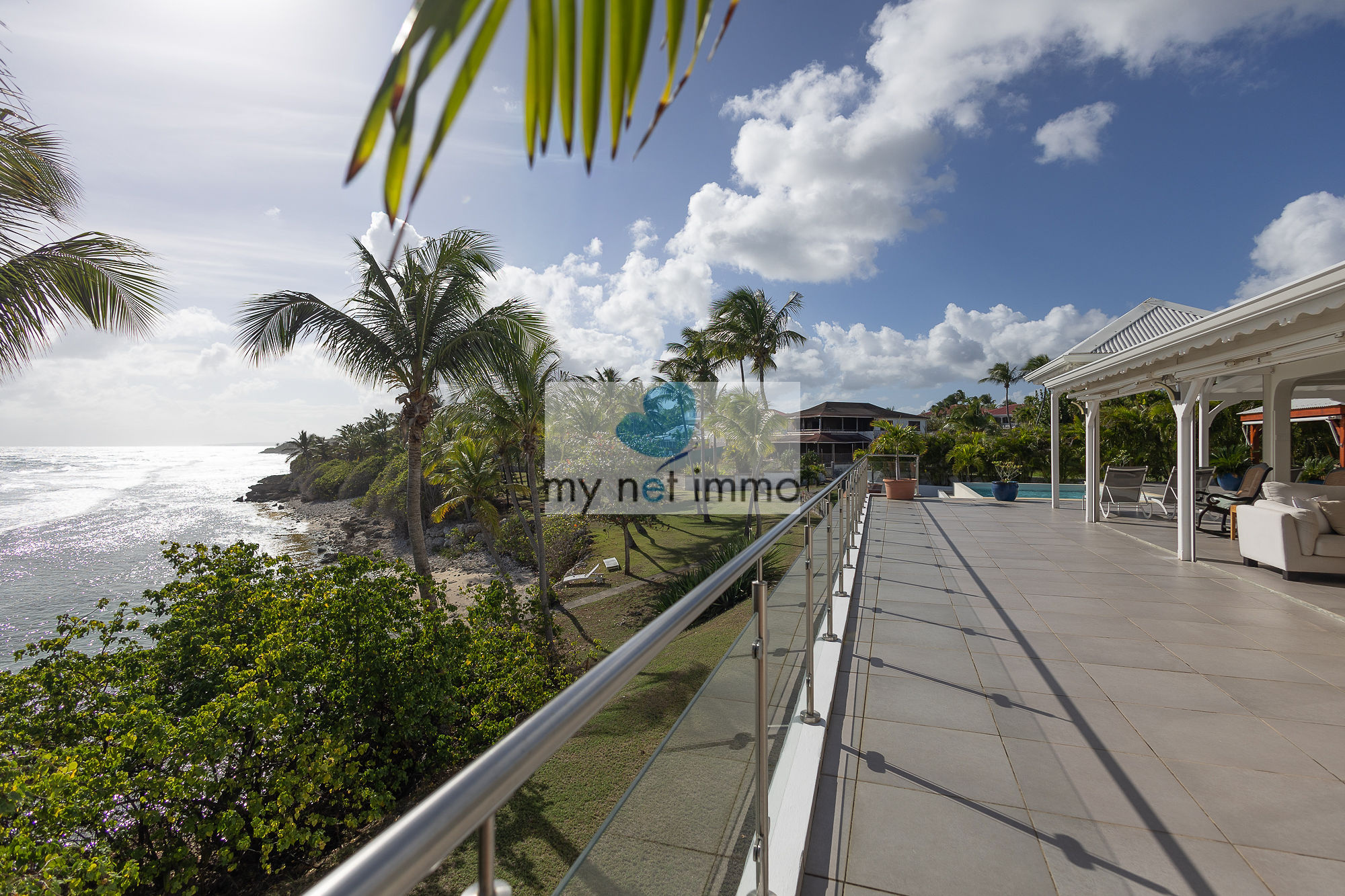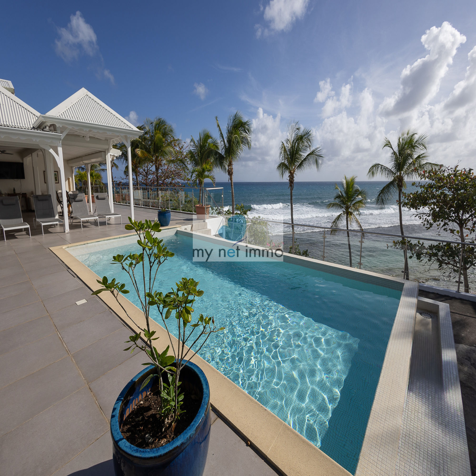 La terrasse ombragée et parfaitement ventilée se prolonge vers un carbet face à la piscine, créant un grand espace de vie extérieur de plain pieds pour se détendre face à la mer.