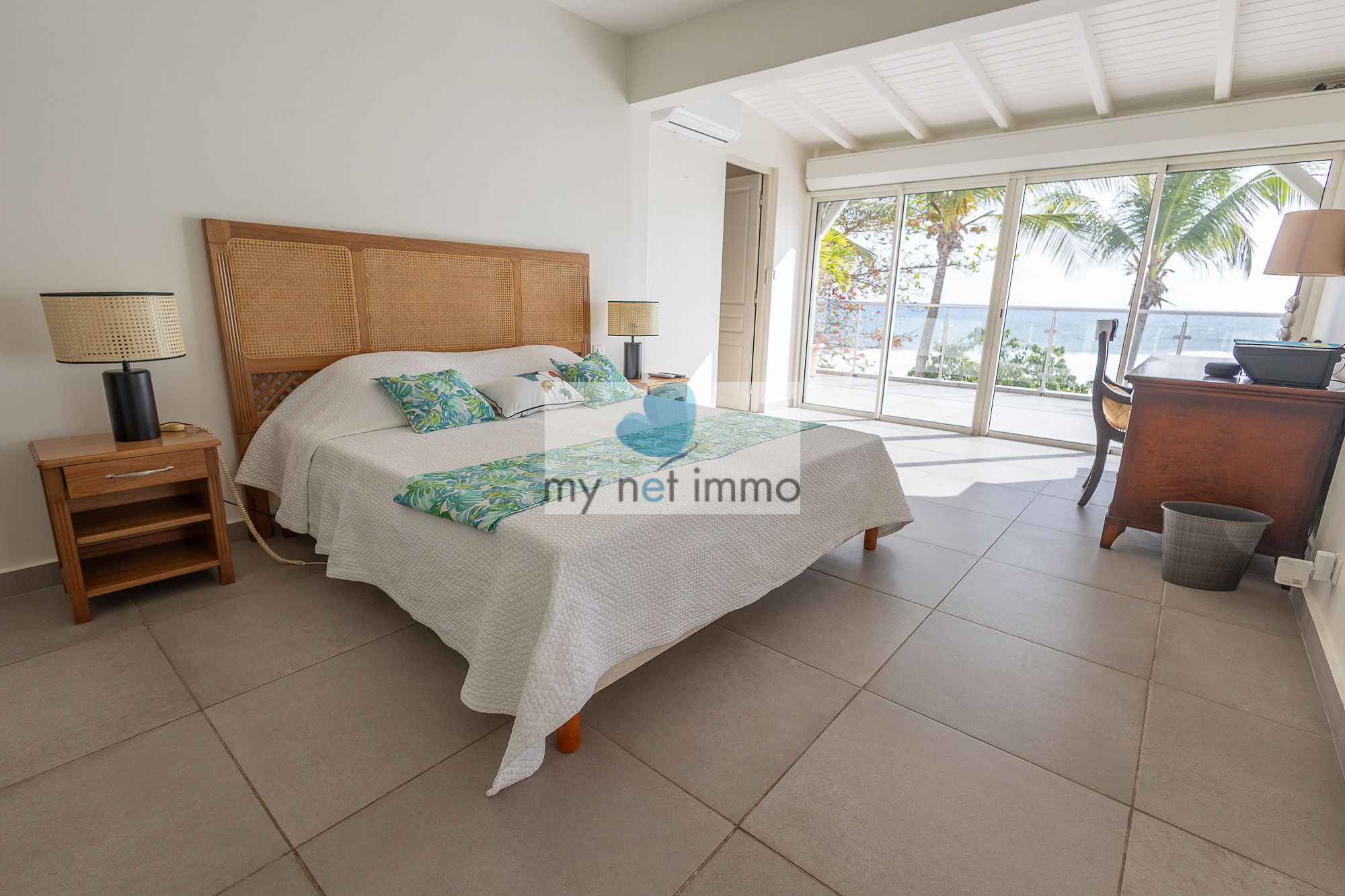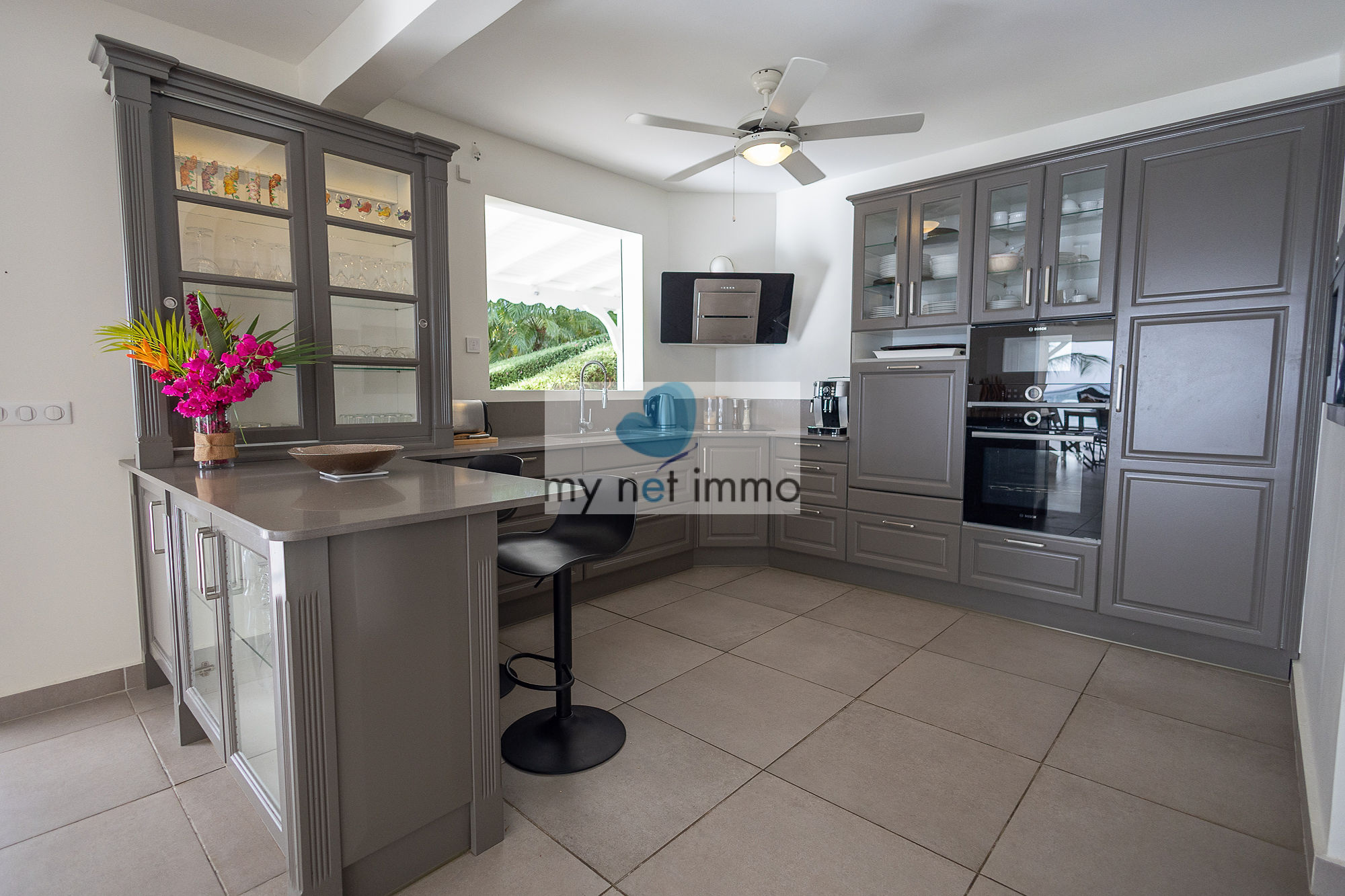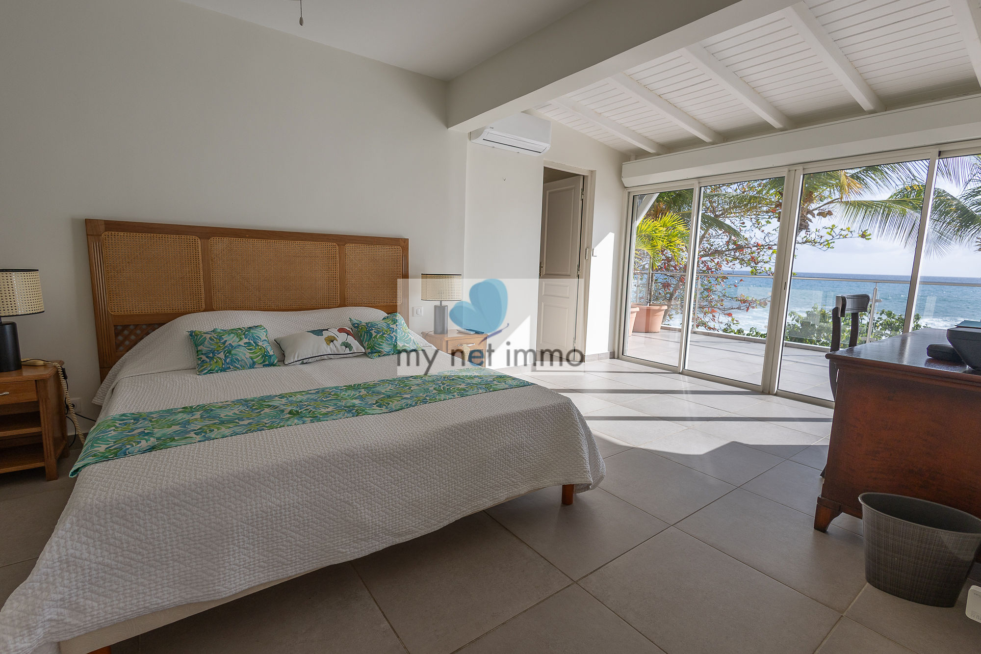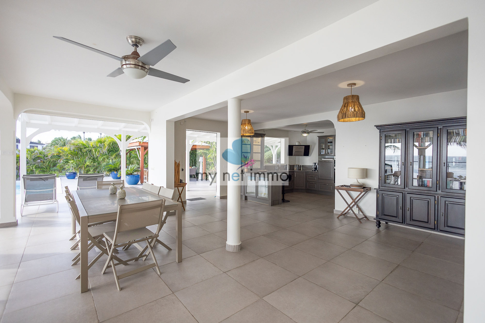 La villa s’organise autour d’un vaste salon lumineux, ouvert sur une vaste terrasse couverte sur laquelle on profite pleinement de la vue mer et des alizés. La cuisine ouverte, entièrement équipée, est complétée par un cellier indépendant.
