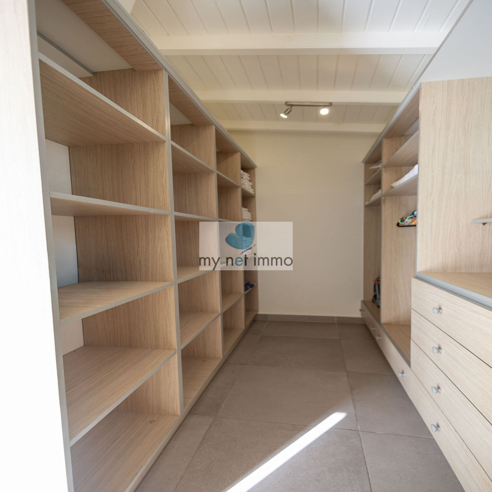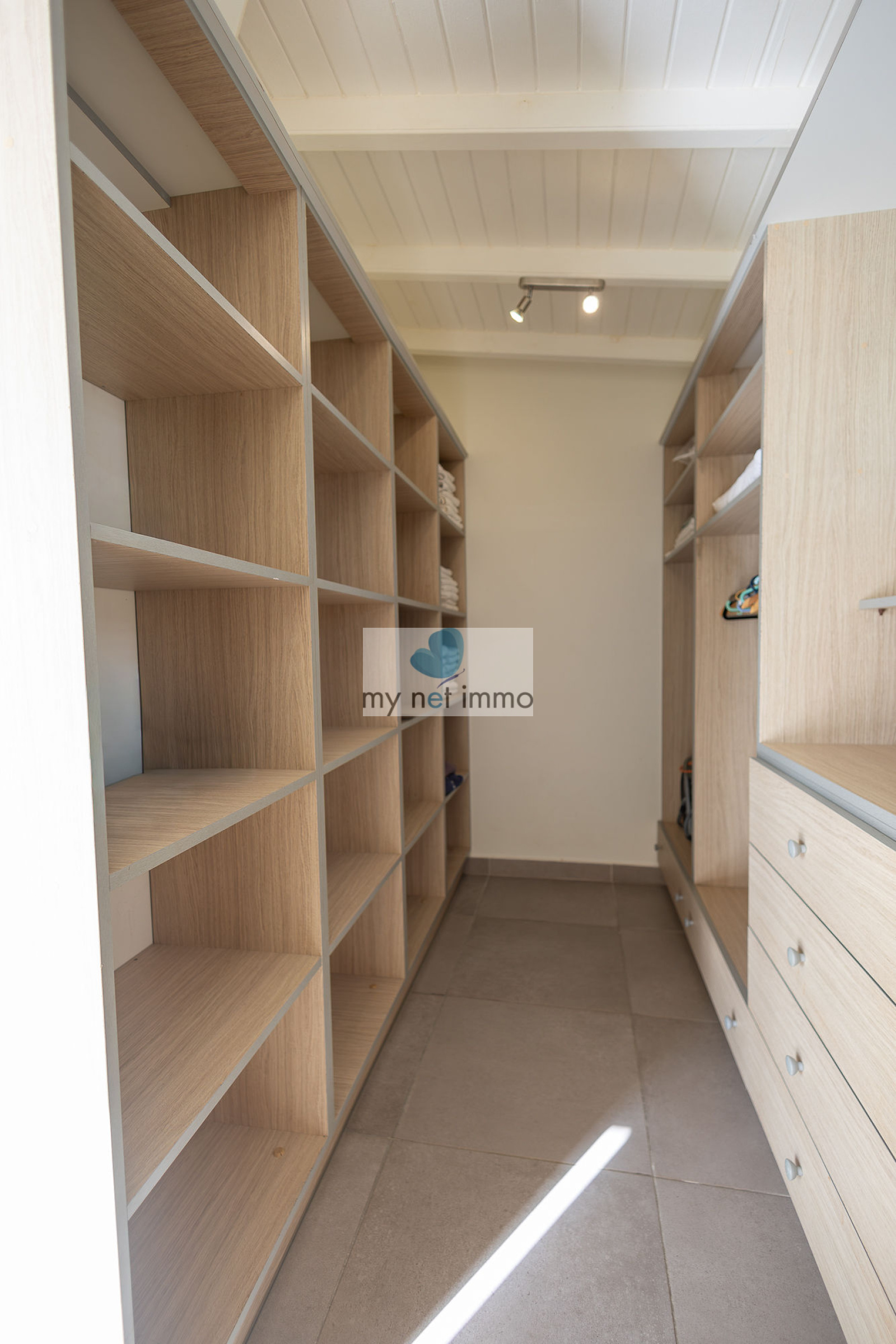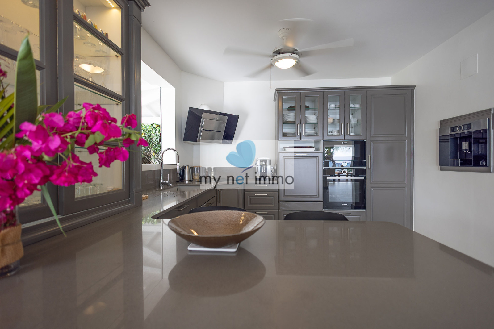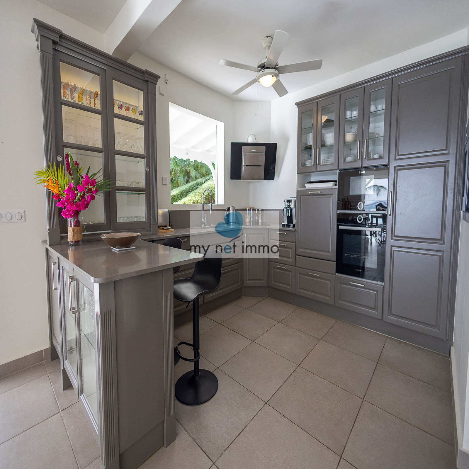 La villa s’organise autour d’un vaste salon lumineux, ouvert sur une vaste terrasse couverte sur laquelle on profite pleinement de la vue mer et des alizés. La cuisine ouverte, entièrement équipée, est complétée par un cellier indépendant.